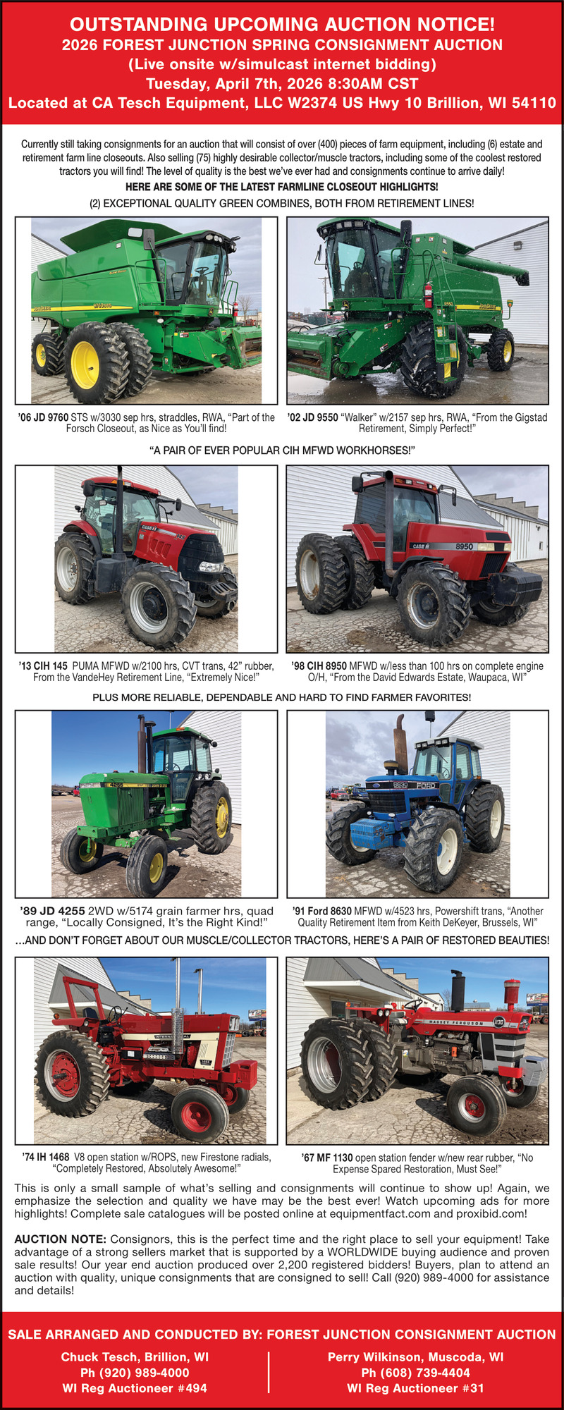 Mar 25, 2026. 2026 Forest Junction Spring Consignment Auction (April 7, 2026) Auctions Ads from The Country Today
