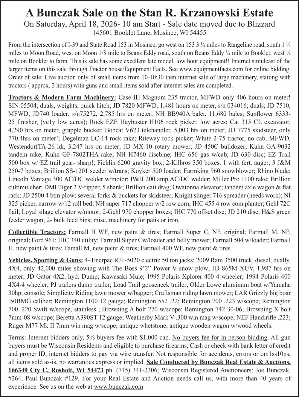 Apr 01, 2026. Bunczak Real Estate & Auctions Auctions Ads from The Country Today
